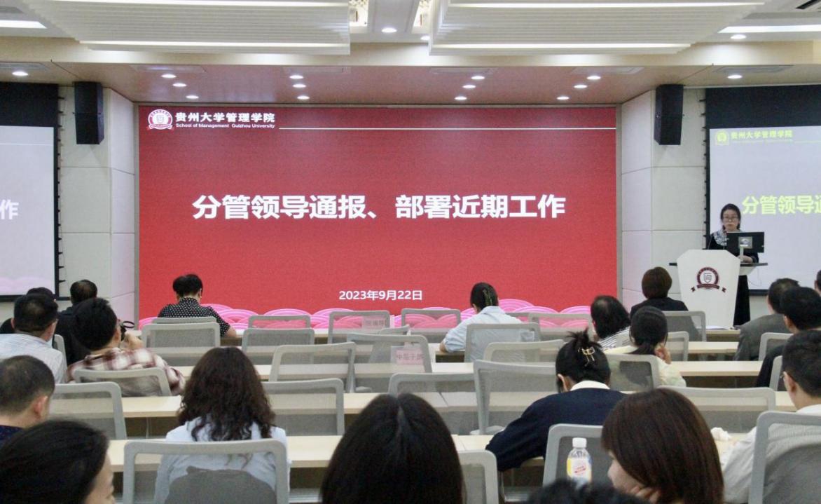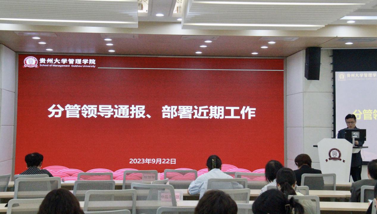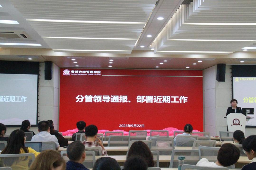 随后,学院各分管领导通报、部署近期工作。院党委副书记邓琳对学生工作、“博学计划”工作、工会工作、关工委工作做了通报、部署。并按照校纪委要求,对贵州省11起违反高校教师职业行为十项准则典型案例作了通报;副院长宋山梅对《贵州大学教学事故认定以及处理办法(修订版)》相关要求进行了通报,并就一流专业建设、本科审核评估做了安排部署;副院长李本光对《管理学院教学科研积分管理办法》、研究生培养、科研工作等作了通报与部署。
