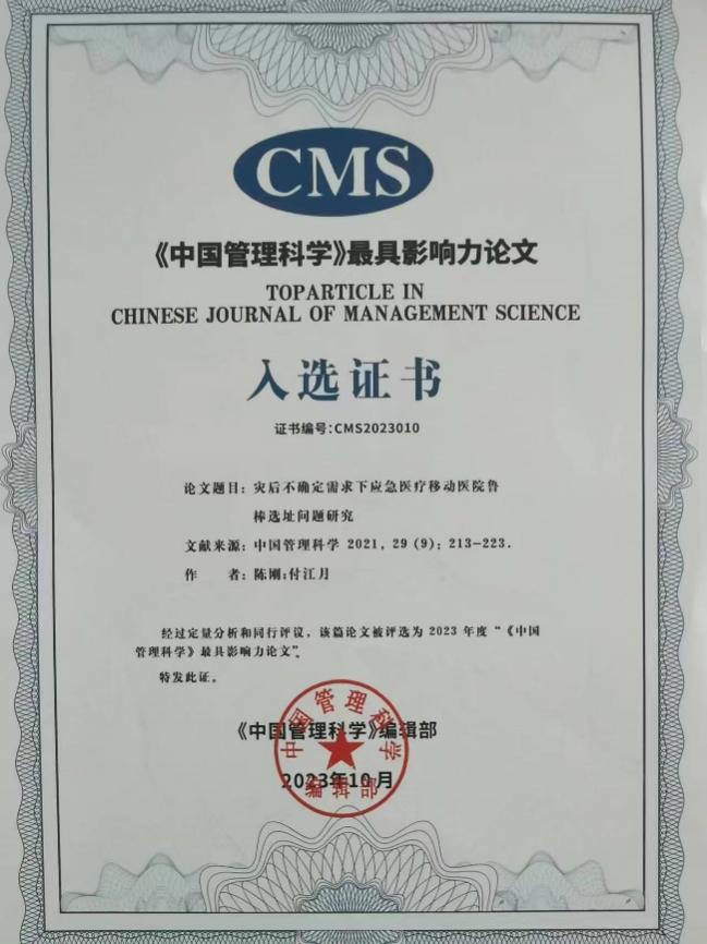 近日,第二十五届中国管理科学学术年会暨优选法统筹法与经济数学研究会2023年年会在武汉华中科技大学举行。体育竞猜网(中国)官方网站陈刚、付江月两位副教授发表于《中国管理科学》2021年第9期的文章《灾后不确定需求下应急医疗移动医院鲁棒选址问题研究》获评2023年度《中国管理科学》最具影响力论文,全国共30篇论文获此殊荣。