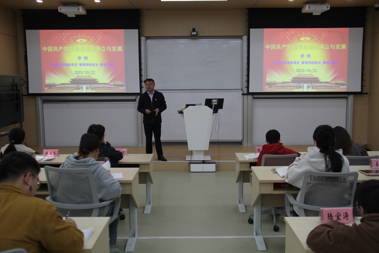 2023年10月22日上午,体育竞猜网(中国)官方网站第三十九期入党积极分子培训班专题党课在致远楼102教室顺利开展。本次课程由贵州大学党委委员、管理学院党委副书记、院长李烨同志担任主讲人,主要内容围绕“中国共产党指导思想的确立与发展”展开。