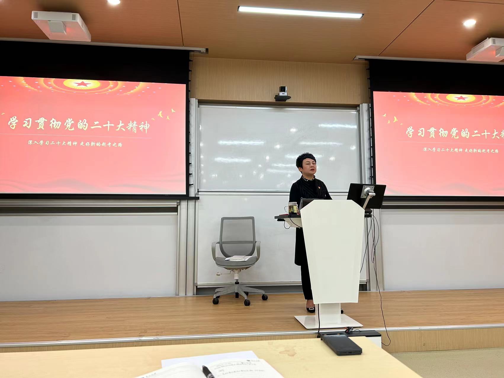 周莉莉副书记围绕主题“学习贯彻党的二十大精神”,首先介绍了中国共产党第二十次全国代表大会的相关内容。党的二十大是在全党全国各族人民迈上全面建设社会主义现代化国家新征程、向第二个百年奋斗目标进军的关键时刻召开的一次十分重要的大会,大会主题是高举中国特色社会主义伟大旗帜,全面贯彻习近平新时代中国特色社会主义思想,弘扬伟大建党精神,为全面建设社会主义现代化国家,全面推进中华民族伟大复兴而团结奋斗。 大会主题明确回答了中国共产党和中国人民在全面建设社会主义现代化国家新征程上举什么旗,走什么路,以什么样的精神状态,朝着什么样的目标继续前进的问题,该主题是大会的灵魂,也是党和国家事业的总纲。