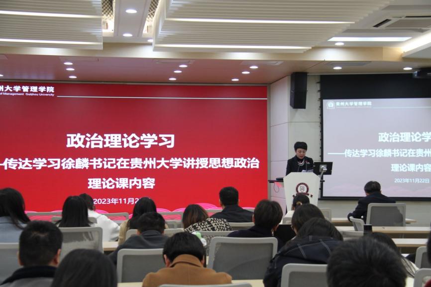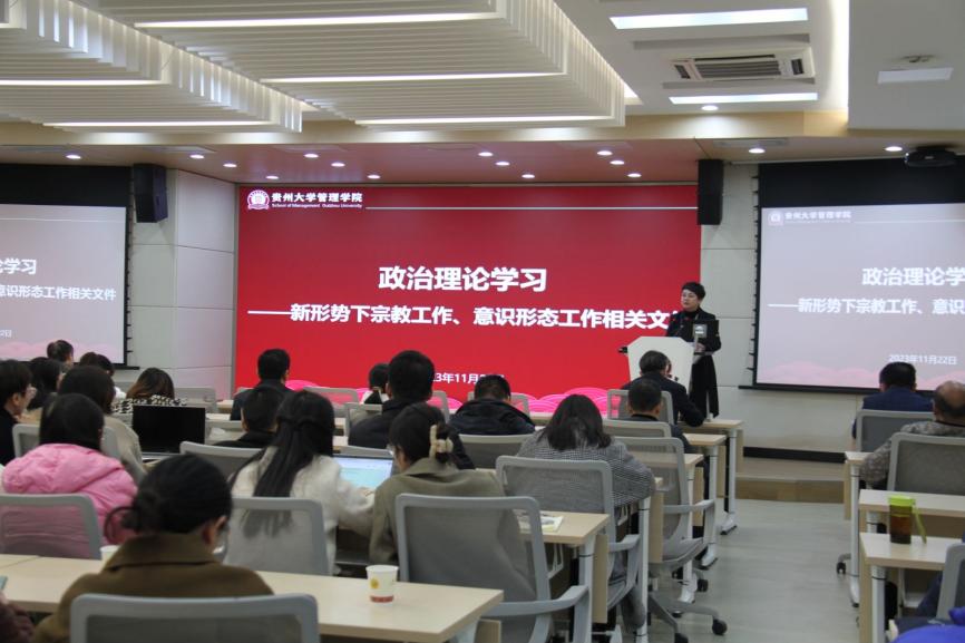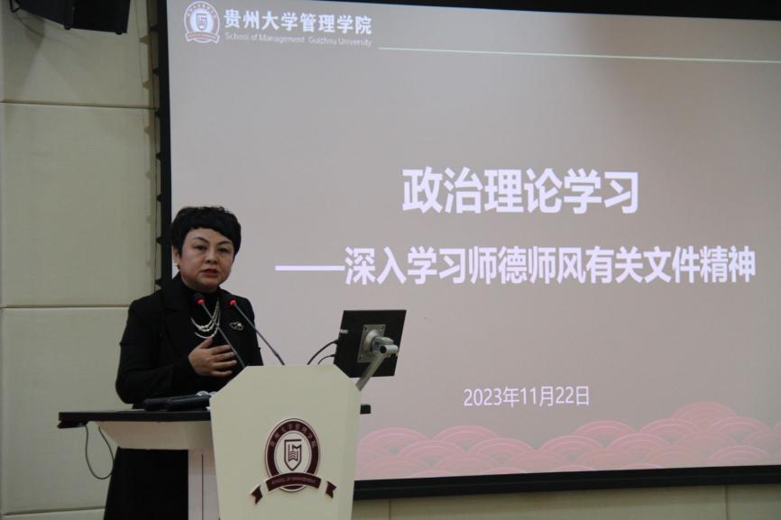 会议伊始,李烨院长代表学院向转入管理学院的辅导员李莹老师表示热烈欢迎。接着,贵州大学党委正处级组织员、管理学院党委副书记(主持党委工作)周莉莉带领大家进行政治理论学习,重点就意识形态、宗教工作、师德师风相关文件精神作了传达学习,她强调,对于学院而言,要加强对报告会、研讨会、讲座、论坛等内容的审核,严格“三审三校”;要加强对学术交流合作、对外文化交流活动以及对境外非政府组织和基金会在校内活动的管理;要严格审查校内各类出版物,坚决封堵政治性有害出版物的渗透。对于教师而言,在教学阵地上、在课堂上、在八小时之外,均要注意自己的言行,以身作则。她还强调,要坚持教育宗教相分离,正确认识和对待宗教问题,同时要做好学生的教育引导。最后,周莉莉书记带领全体教职工回顾了省委书记、省人大常委会主任徐麟给贵大全体师生讲授思政课的内容,并希望大家要牢记嘱托,感恩奋进,助力贵州大学更好地在推动全省高质量发展上发挥示范引领作用,在服务主战略实施上做出应有的贡献。