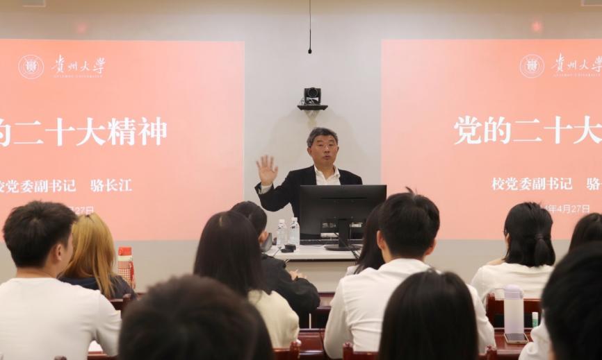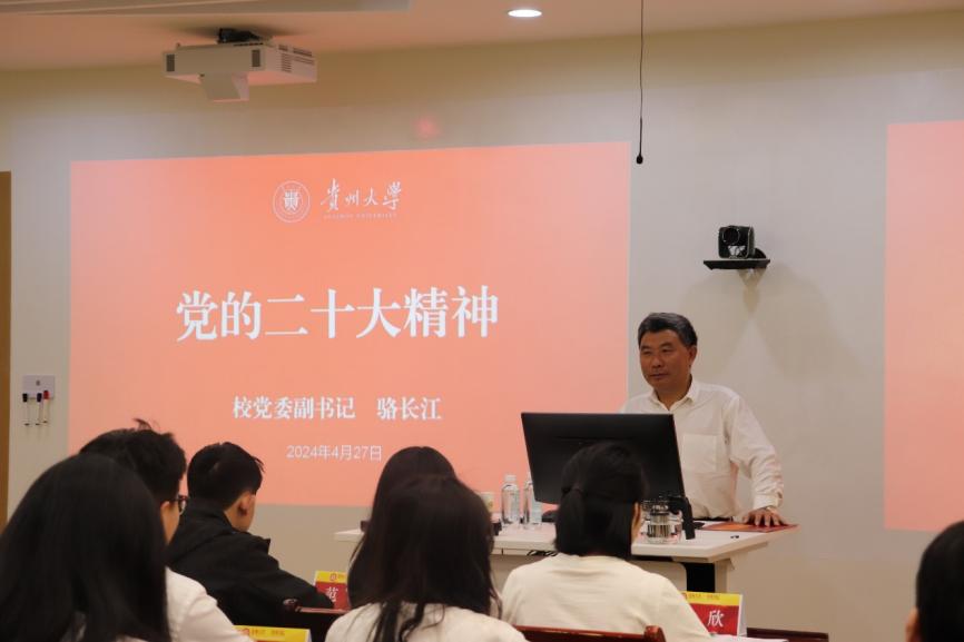 2024427上午,体育竞猜网(中国)官方网站分党校第四十期入党积极分子专题党课——党的二十大精神,在管理学院致远楼402教室举行。贵州大学党委副书记骆长江担任主讲人。