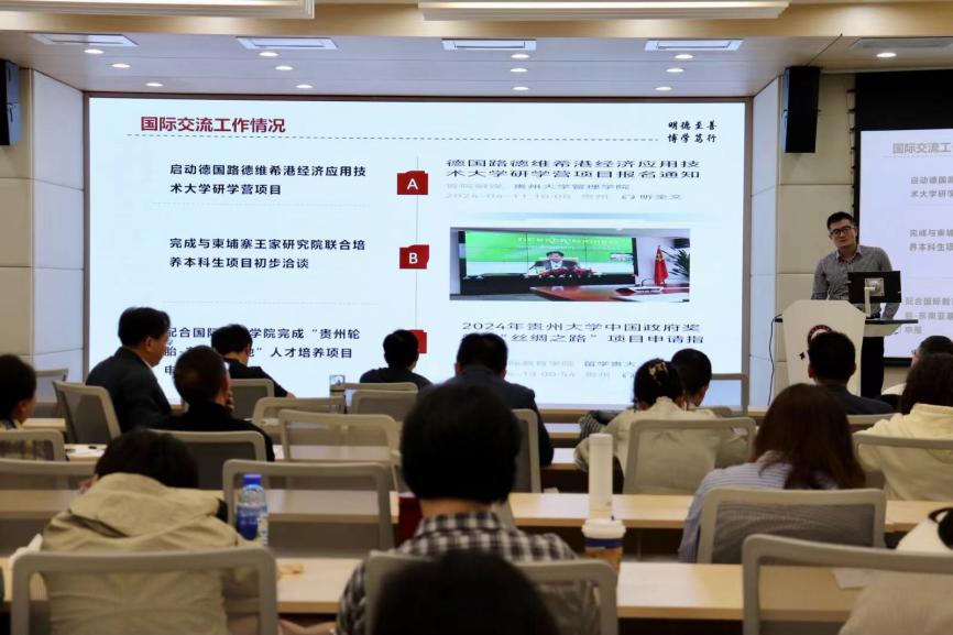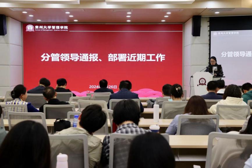 分管领导通报、部署近期工作。学院副书记邓琳就学生就业情况、保研考研情况、团委工作、学科竞赛工作、资助工作以及招生工作、纪检工作进行了通报和部署安排;副院长许为宾从国际交流工作、实验室与案例研究中心工作和本科教育教学审核评估工作三个方面对4月份工作推进情况进行了详细通报,并对下一步工作进行安排部署;副院长李本光就《体育竞猜网(中国)官方网站教学科研积分管理办法(2024年修订)》《贵州大学本科生导师制管理办法(修订)》《管理学院2024年学术型硕士研究生指导教师资格年审工作方案》等重要文件作了通报和传达,强调要将文件内容落实到具体工作中去。