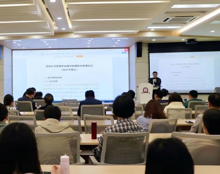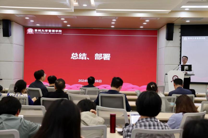 会议伊始,贵州大学党委正处级组织员、管理学院党委副书记(主持党委工作)周莉莉带领大家进行政治理论学习。重点对“习近平总书记关于中国式现代化的重要论述”“习近平总书记关于高质量发展的重要论述”“习近平总书记在中央经济工作会议上的重要讲话” “省委经济工作会议精神” “2024年贵州省政府工作报告”等进行了传达学习,同时带领大家深入学习了师德师风的有关文件和精神,并对贵州大学教师师德师风考核实施办法进行详细学习。