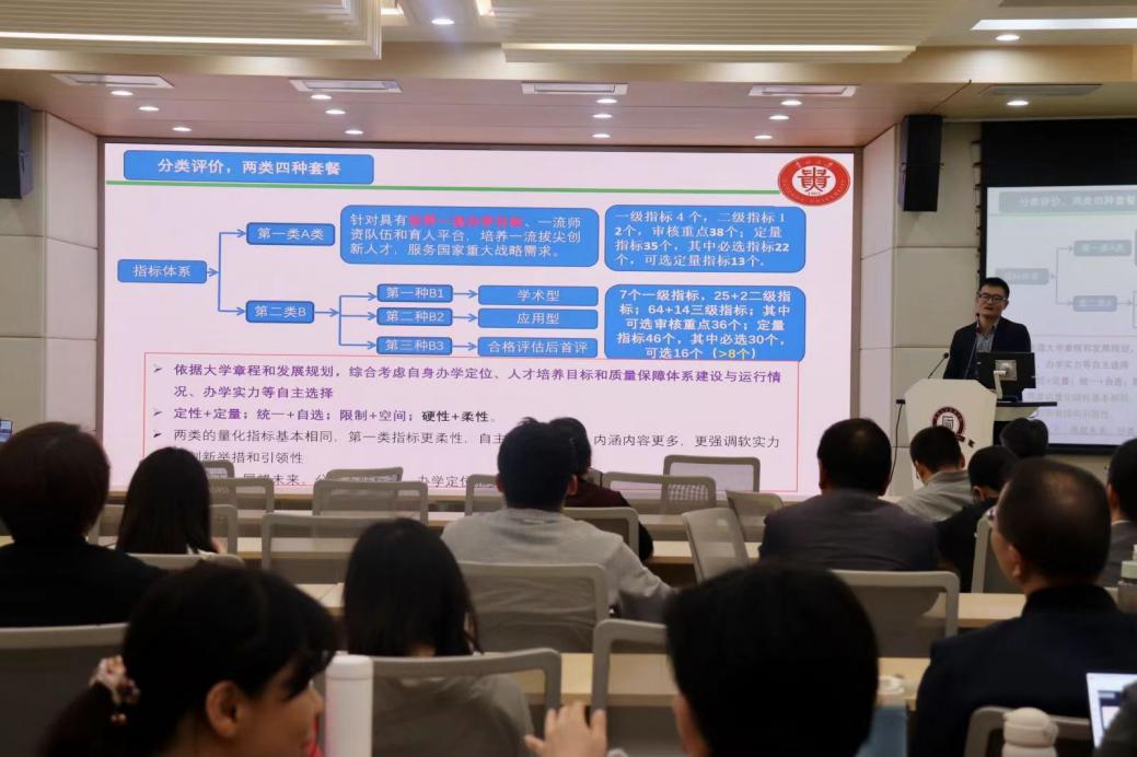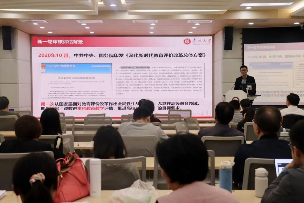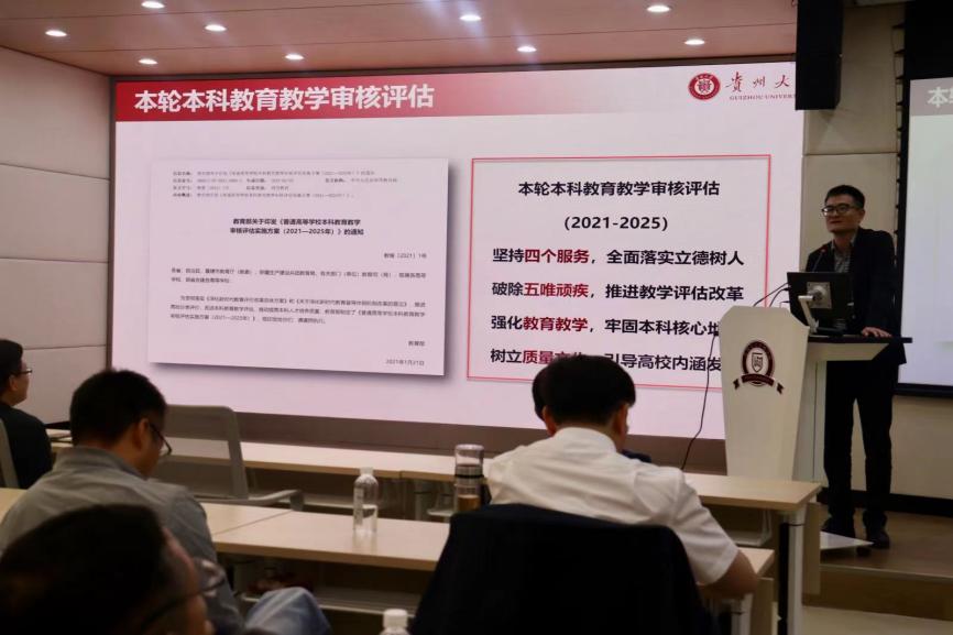 第一项学习内容是审核评估相关的背景与内涵。新一轮本科教育教学审核评估依据的是2020年10月中共中央、国务院印发的《深化新时代教育评价改革总体方案》,该方案明确提出“改进本科教育教学评估,推进高效分类评价”的目标要求;新一轮本科教育教学审核评估的时间为2021-2025年。在此基础上,许为宾副院长讲解了新一轮审核评估的原则、特点、方案、内容、以及贵州大学的方案选择等知识。