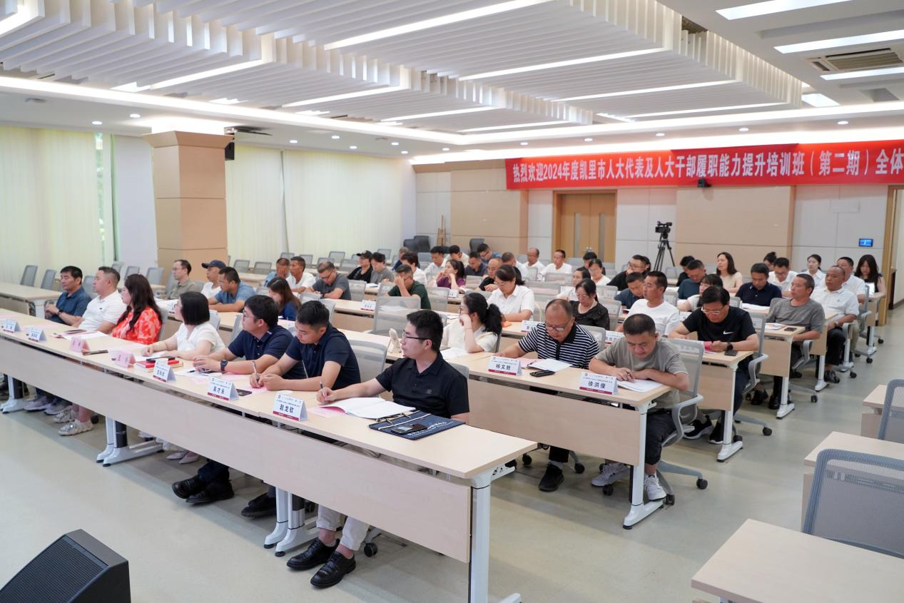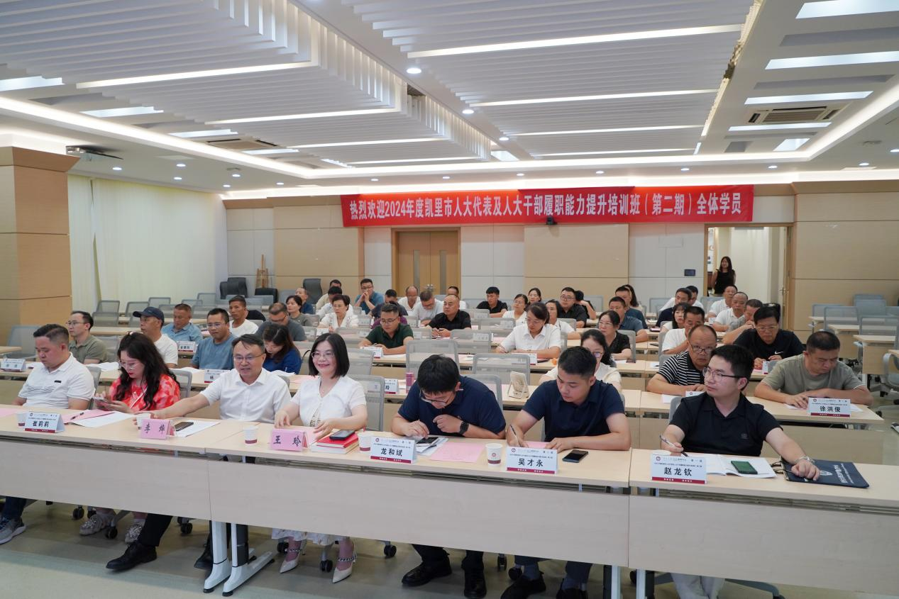 李烨院长在致辞中表示,新时代、新征程,人大代表和人大干部的角色变得更加重要。为深入学习习近平新时代中国特色社会主义思想和习近平总书记对贵州工作重要指示批示精神,认真贯彻党的二十大精神及中央、省委、州委人大工作会议精神,切实提高市人大代表、人大干部的综合素质和履职能力,凯里市人大常委会决定在我校举办本次培训班。新形势下应不断加强代表工作能力建设,为加快发展新质生产力,扎实推进高质量发展贡献人大力量。