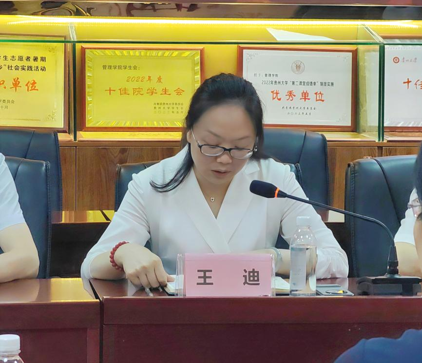 王迪同志作表态发言。她表示,坚决拥护校党委决定,并由衷感谢组织的培养和信任。面对管理学院这个新环境,她深感使命光荣、责任重大。未来,她将在学校党委的领导下,与学院党政班子团结协作,虚心向李烨院长和各位同事学习,尽快熟悉学院情况,严格落实学校党委的各项工作部署。她将团结依靠全院师生,加强党建引领,推动学院各项工作有序发展,不断增强师生的幸福感、获得感和归属感,为贵州大学的建设贡献力量。